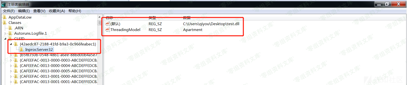 在注册表位置为`HKCU\Software\Classes\CLSID\`下创建项`{42aedc87-2188-41fd-b9a3-0c966feabec1}`,再创建一个子项`InprocServer32`,默认的键值为我们的dll路径,再创建一个键`ThreadingModel`,其键值:`Apartment`