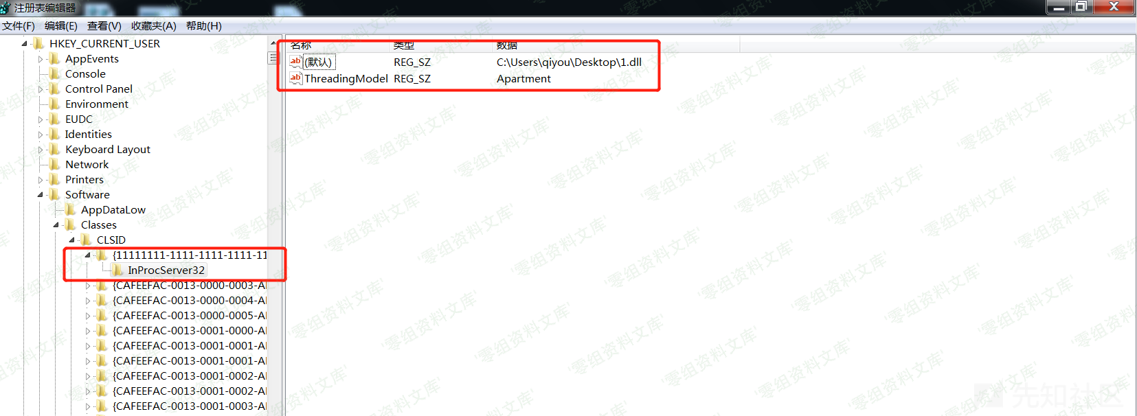修改一下注册表,注册表路径:`HKEY_CURRENT_USER\Software\Classes\CLSID\`,新建子项`{11111111-1111-1111-1111-111111111111}`(名字随便,只要不与注册表中存在的名称冲突就行),然后再新建子项`InProcServer32`,新建一个键`ThreadingModel`,键值为:`Apartment`,默认的键值为我们`dll`的路径