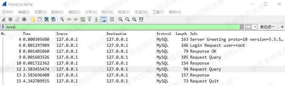 mysql -h127.0.0.1 -uroot -p#必须指定-h,否则流量不走网卡,无法抓取