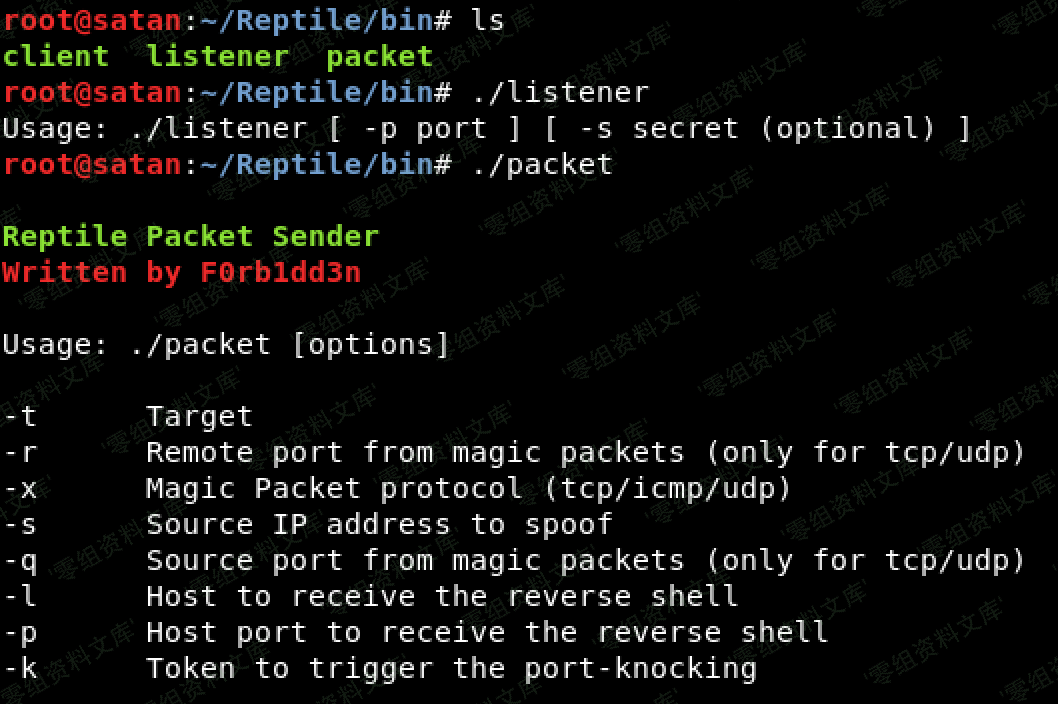 `reptile`名称中具有的所有文件和文件夹将被隐藏。您可以在安装之前进行配置。以下命令隐藏/取消隐藏文件,文件夹,进程和内核模块本身。