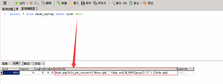 (3)执行EXP后,将向数据库表dede_mytag中插入一条记录,