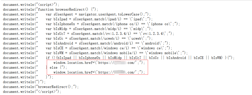 我们可以发现,攻击者通过这段js代码判断手机访问来源,劫持移动端(如手机、ipad、Android等)流量,跳转到https://262706.com。