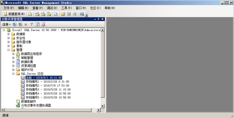登录到SQL Server Management Studio,依次点击 管理–SQL Server 日志