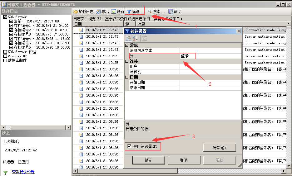 在日志文件查看器中,选择筛选,在筛选设置中源设置为“登录”,应用筛选器,确定。