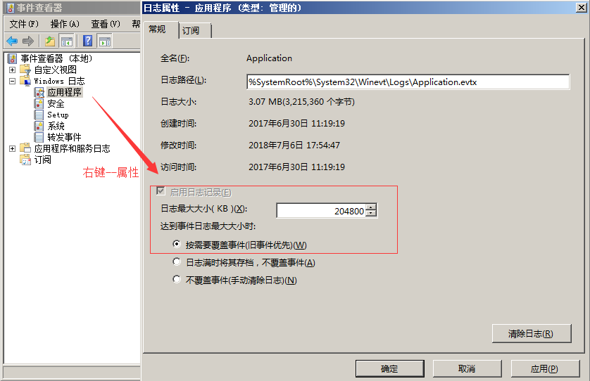 **设置2**:设置合理的日志属性,即日志最大大小、事件覆盖阀值等: