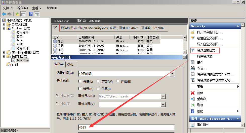 3. 在安全日志右侧操作中,点击**“筛选当前日志”**,输入事件ID进行筛选。
