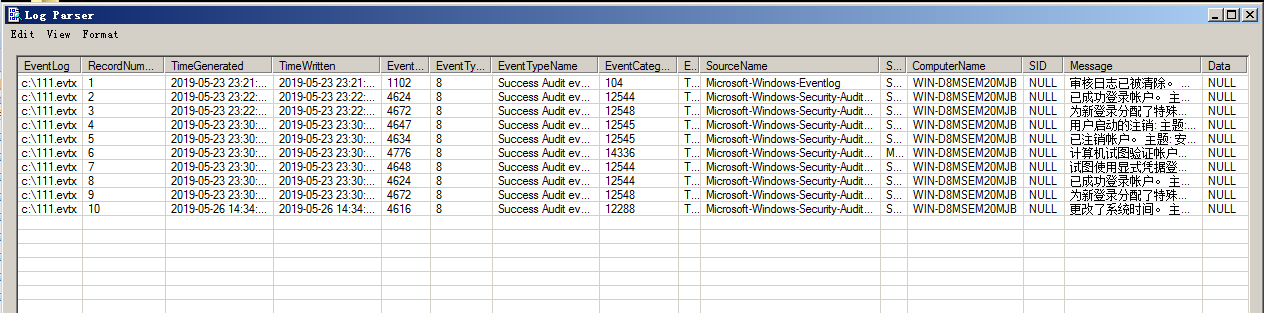 Logparser.exe –i:EVT –o:DATAGRID “SELECT * FROM c:\xx.evtx”