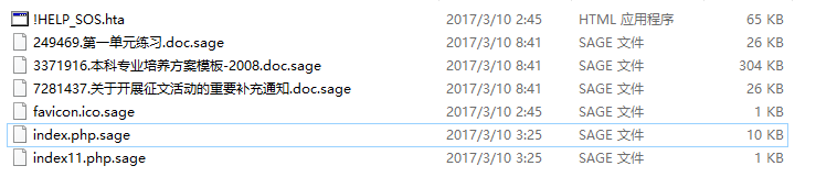 登录网站服务器进行排查,在站点目录下发现所有的脚本文件及附件都被加密为.sage结尾的文件,每个文件夹下都有一个!HELP_SOS.hta文件,打包了部分样本: