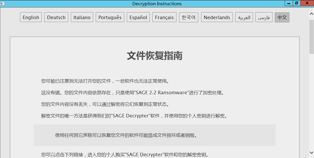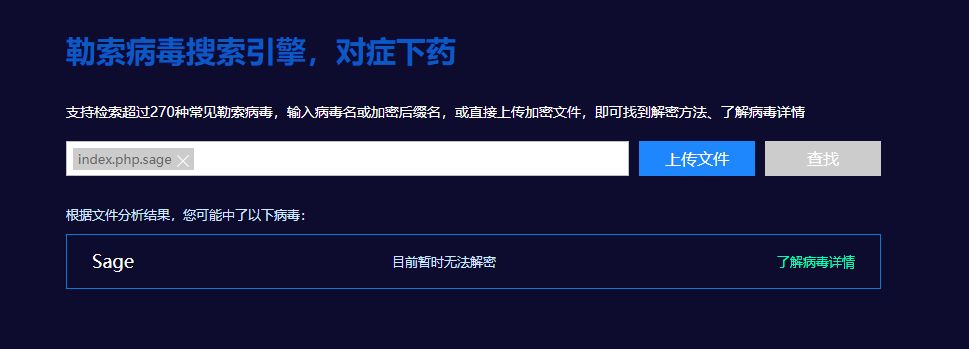 到这里,基本可以确认是服务器中了勒索病毒,上传样本到360勒索病毒网站(http://lesuobingdu.360.cn)进行分析:确认web服务器中了sage勒索病毒,目前暂时无法解密。